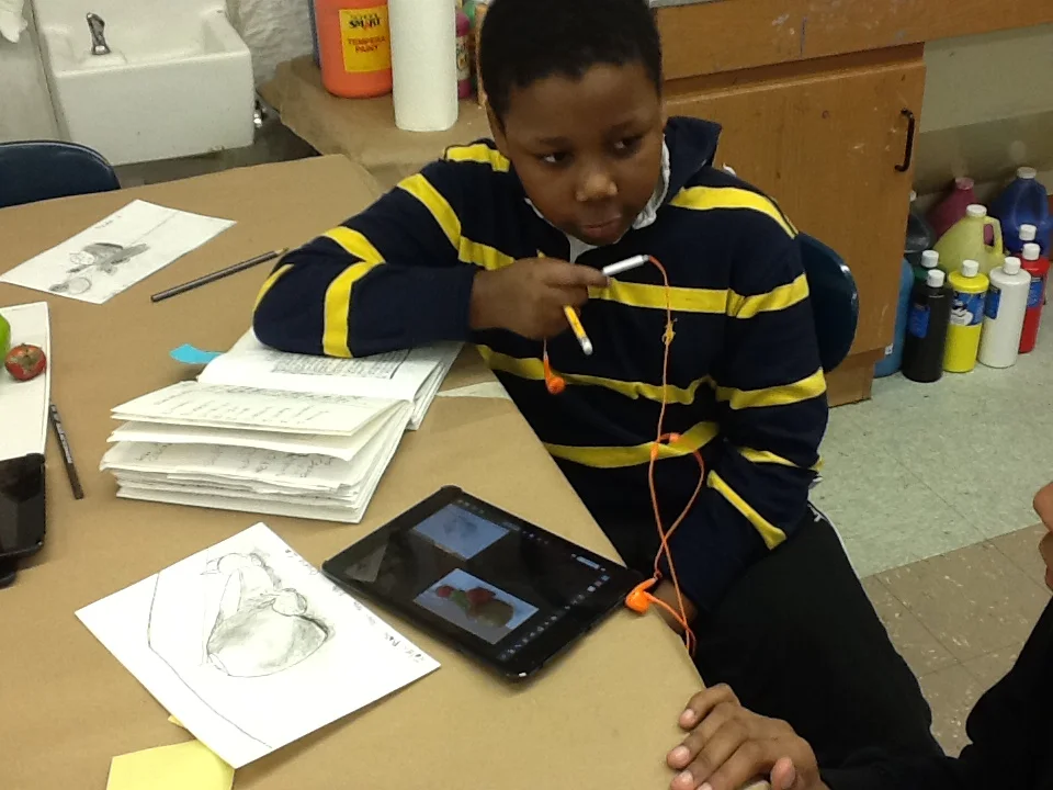 This unit included multiple uses of online video, SMARTboard, web based resources, iPads, and selected apps. Students became skilled using the Explain Everything app on the iPads to capture each other’s work and provide feedback. They also used the iPad’s camera to photograph their still life so that they had documented object relationships for assembly in following sessions. Students captured their work at various stages and were able to track the work as it progressed. The instructors used an iPad and SMARTboard to record and display demonstrations. Recording teacher demonstrations meant that students who needed a refresher could simply view them again on an iPad, rather than having the teacher redo her demonstration. This allowed the teacher more time to work with more students.